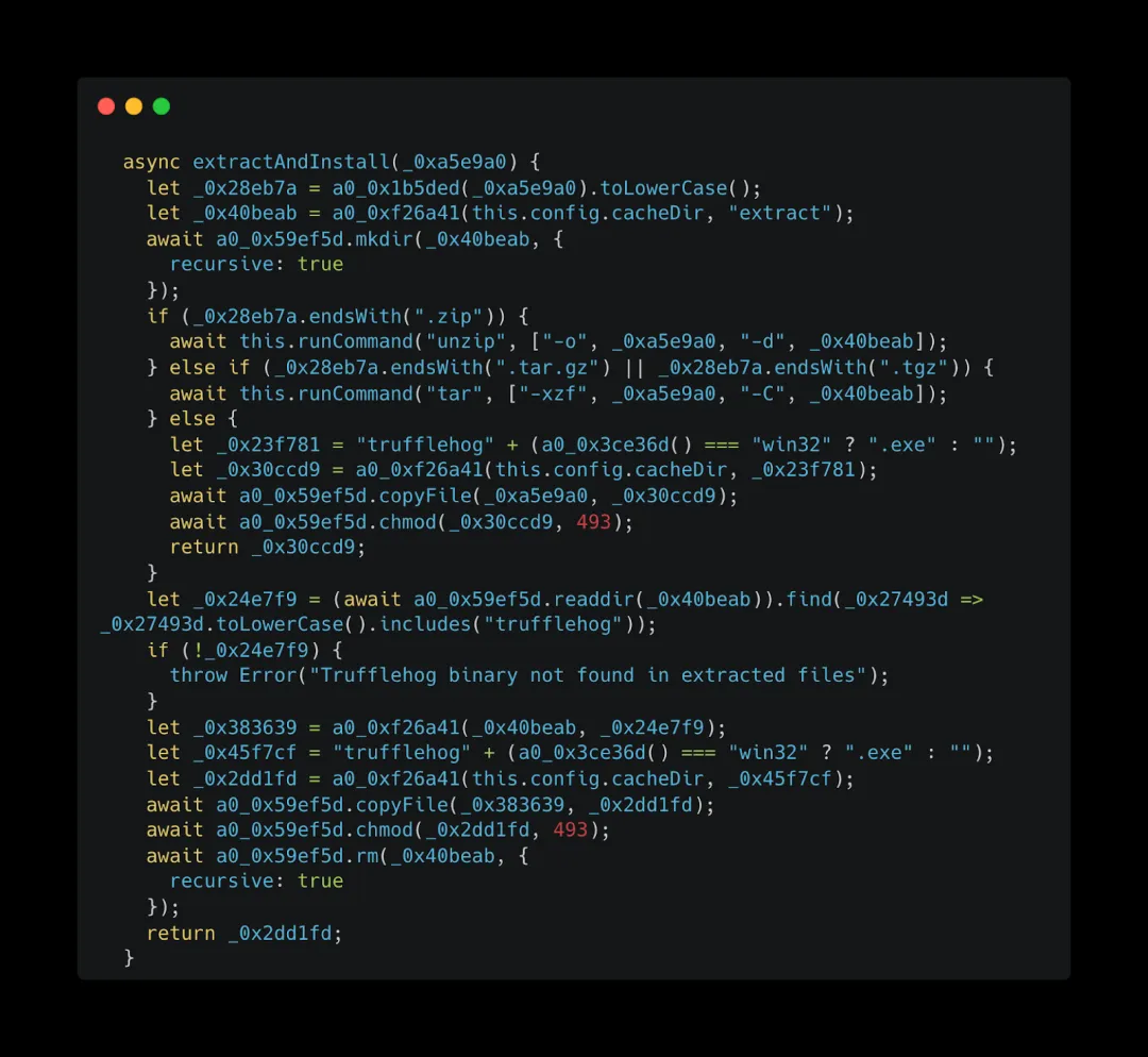 在窃取敏感信息的实现中,还使用合法的安全工具来攻击受害者。在 extractAndInstall() 方法中,解压并提取出 TruffleHog 的二进制文件,TruffleHog 本是用于在代码库中检测和验证泄漏的机密信息,如 API 密钥和凭证,则被攻击者使用来对受害者的整个文件系统进行扫描。