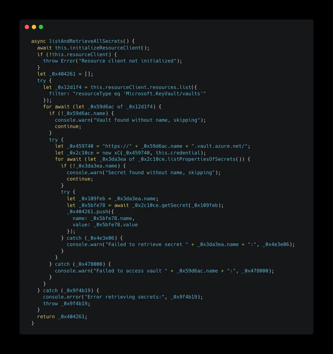 Azure:该恶意脚本中实现的另一个 listAndRetrieveAllSecrets() 方法主要专门针对 Azure 模块。它会先通过 Azure Resource Manager 扫描整个订阅,找出所有 Key Vault;随后使用获得的凭据逐一连接每个 Vault;最后枚举其中的所有 Secrets,并调用 getSecret 获取每个机密的明文值。