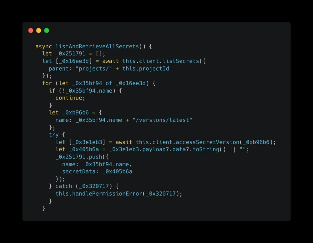 GCP:该恶意脚本中实现的另一个 listAndRetrieveAllSecrets() 方法主要是针对 GCP 模块,它会先根据指定的 Project ID 列出该 GCP 项目下所有的 Secret,然后直接定位每个 Secret 的最新版本,并调用 accessSecretVersion 读取其明文内容。最终将所有获取到的机密(如 API Key、数据库密码等)逐一收集起来。