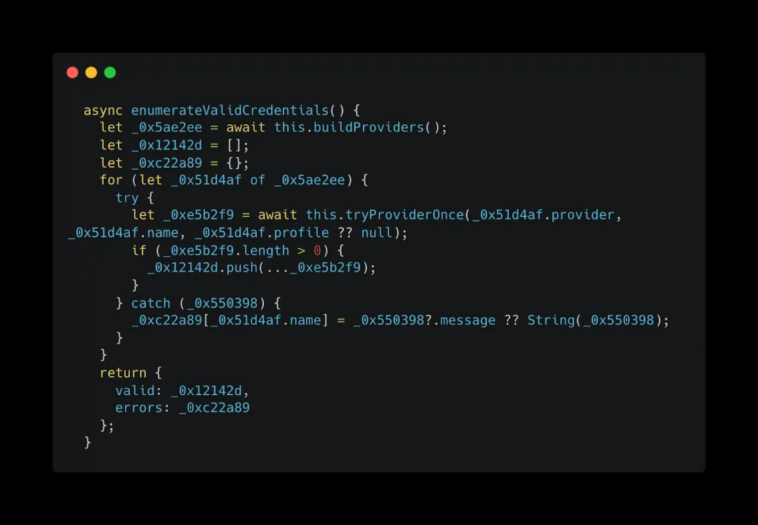 而 enumerateValidCredentials() 方法主要用来全面搜集所有能用的云服务密钥。它会从环境变量、配置文件、CLI 登录等各种来源逐一尝试,凡是能成功验证的凭据都会被记录下来,供后续窃取云端机密时使用。