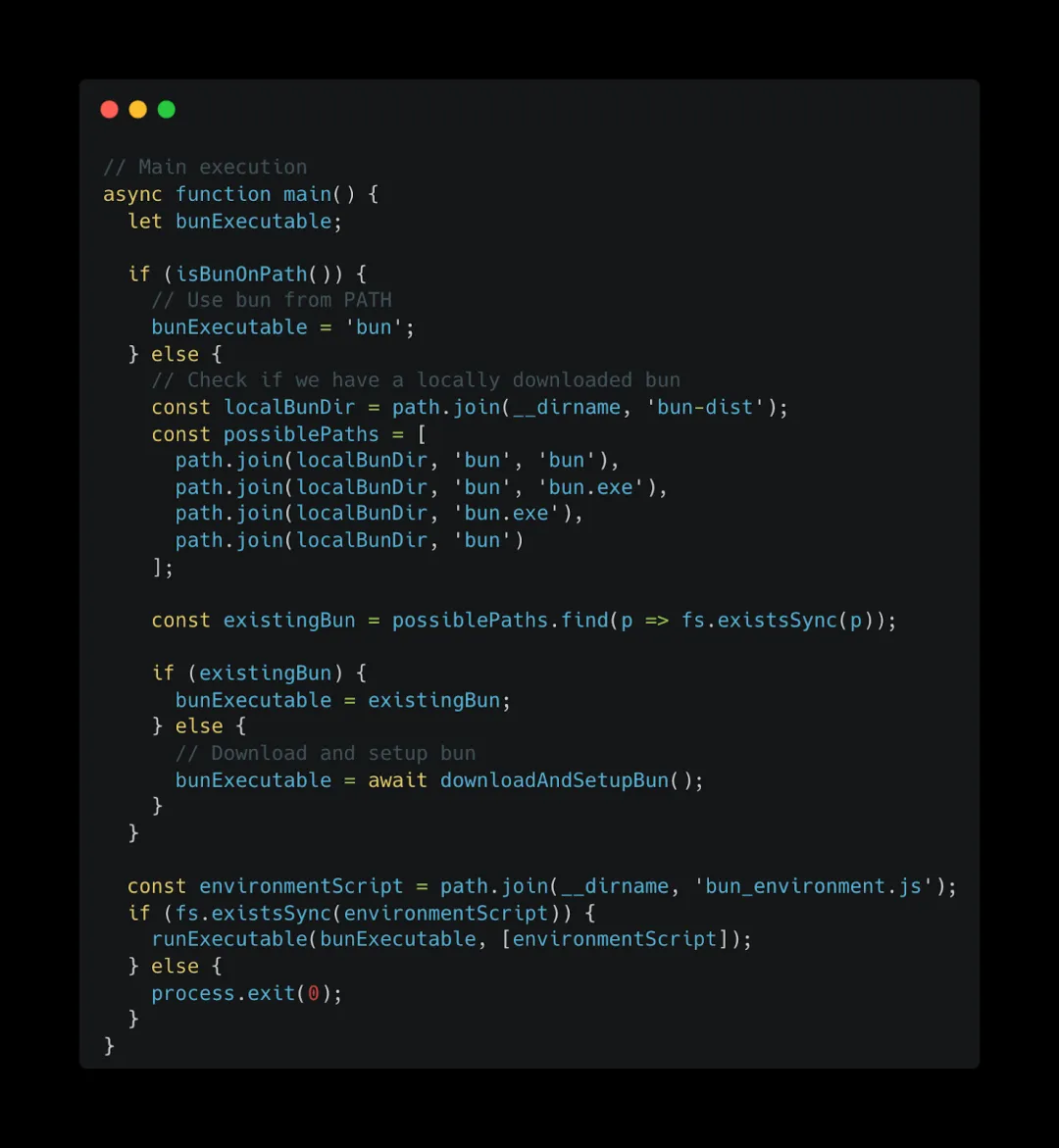 在 setup_bun.js 中,首先会去检查系统是否已经安装了 Bun,如果未安装,会自动从官方下载并安装 Bun,并且正确设置环境变量以便找到 Bun 可执行文件。