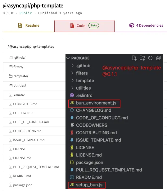以 @asyncapi/[email protected] 包为例,在对比旧版本 @asyncapi/[email protected] 时可以发现,0.1.1 版本比 0.1.1 版本新增了两个 js 文件,为 setup_bun.js 和经过混淆的 bun_environment.js 文件。