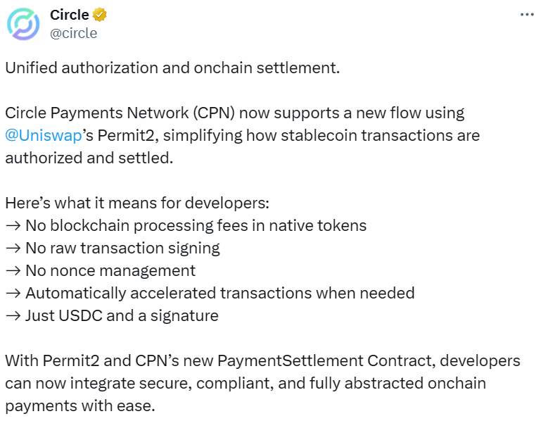 - Circle 支付网络支持基于 Uniswap Permit2 的新流程