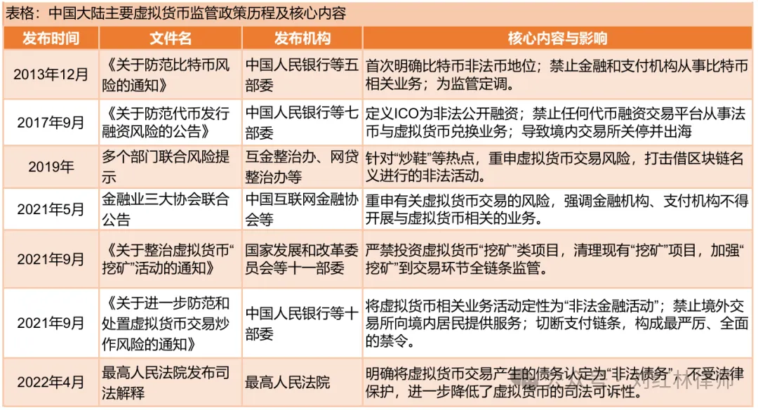 首先我们来看内地政策,中国内地对加密货币的态度和监管政策经历了一个逐步收紧、全面禁止的过程,反映了监管层对于加密货币带来的金融风险、洗钱、资本外流以及对法定货币体系冲击的防范。