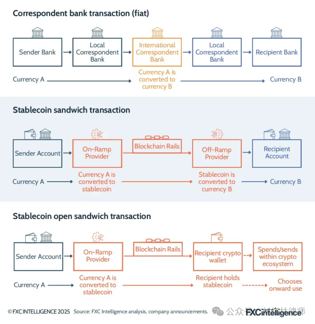 具体来看,目前主流稳定币 B2B 支付的工作原理,可以细分为 “稳定币三明治模式” 和 “支付网关模式”: