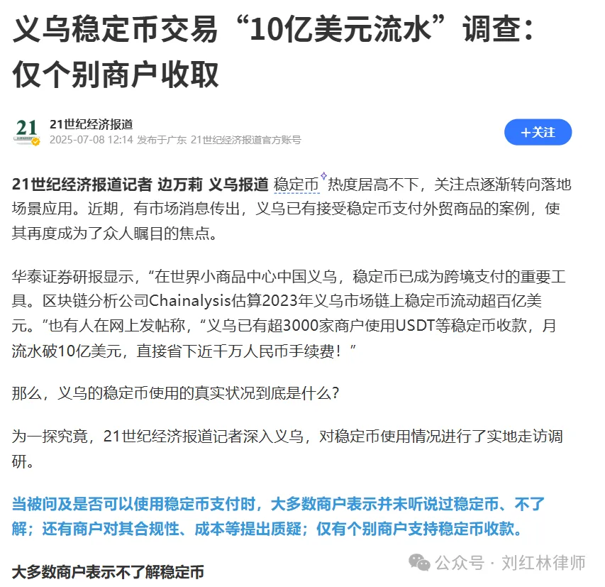 2025 年 7 月,一则关于义乌商家使用稳定币进行跨境贸易的消息在业内流传,援引的消息来源主要是两个:华泰证券研报显示稳定币已成为义乌跨境支付的重要工具,区块链分析公司 Chainalysis 估算 2023 年义乌市场链上稳定币流动超百亿美元。