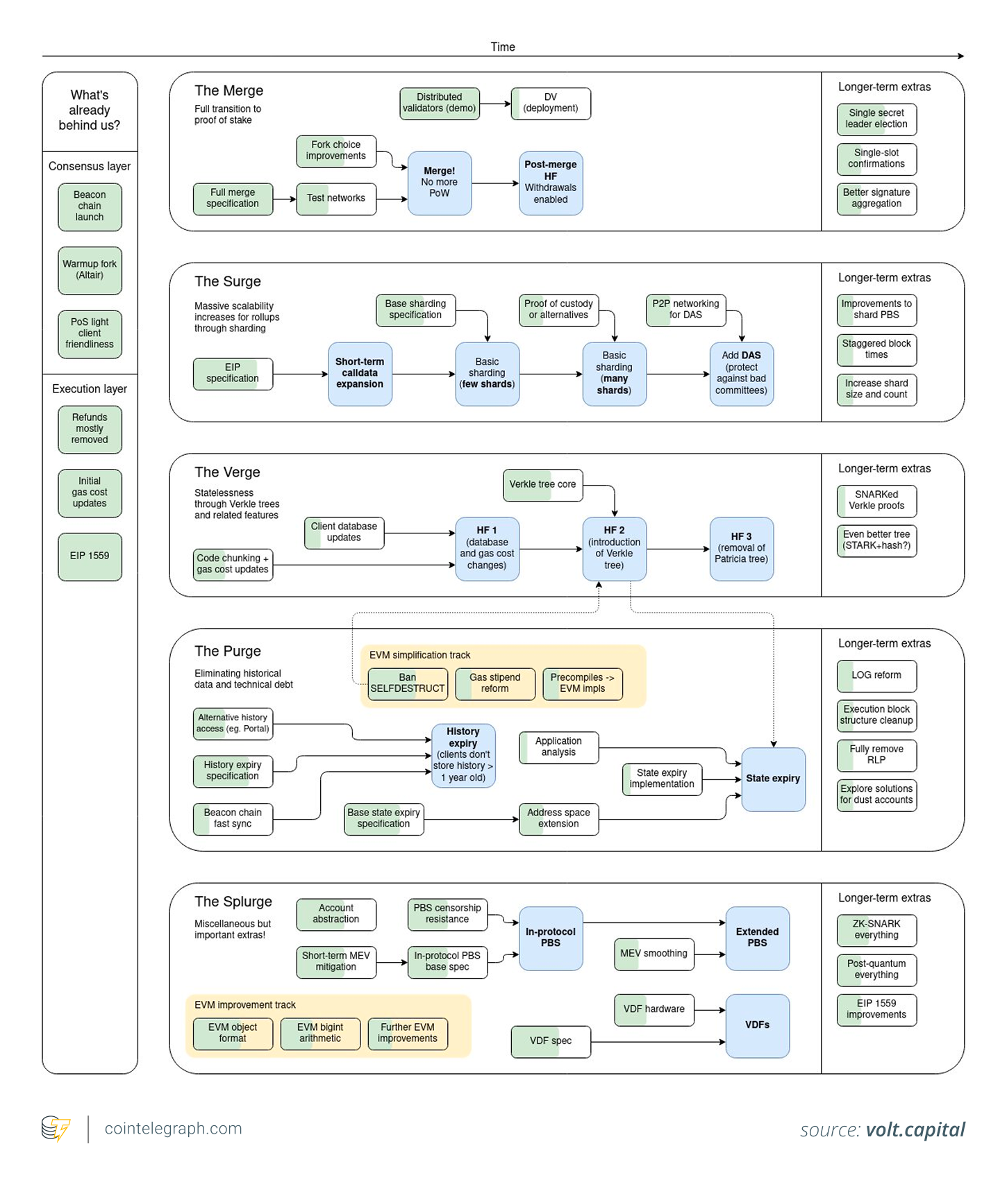 这些升级与 Vitalik Buterin 简略的路线图相符:Merge、Surge、Verge、Purge 和 Splurge。Surge 旨在通过 Rollup 和更好的数据可用性来扩展以太坊,而 Verge 和 Purge 则侧重于更轻量级的客户端和清除旧的历史记录。