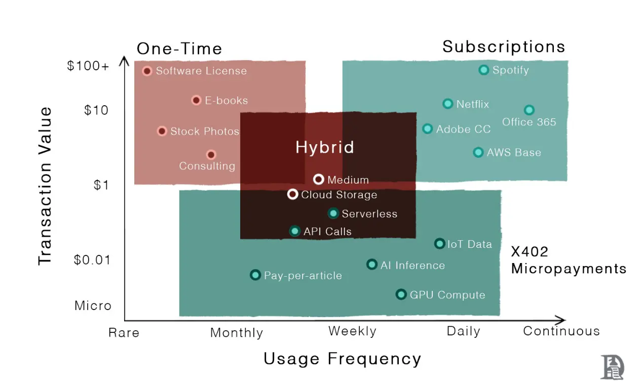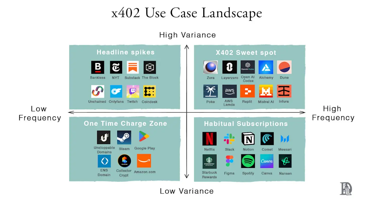 一旦网络支持原生支付,会在哪里率先兴起?答案在于高频使用领域,即交易金额低于 1 美元的区域。只要区块链费用保持在合理范围内,x402 就能以机器速度结算每个请求,最小粒度可达 0.01 美元。