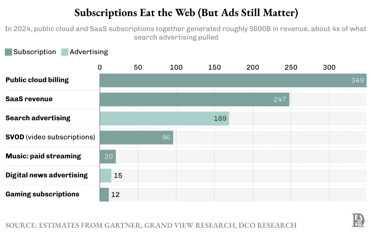 亚马逊、Spotify、网飞、谷歌和 Meta,成为了聚合平台,他们汇集了消费者的需求,并将随意的浏览行为转变为习惯。他们将这些习惯定价为订阅服务。