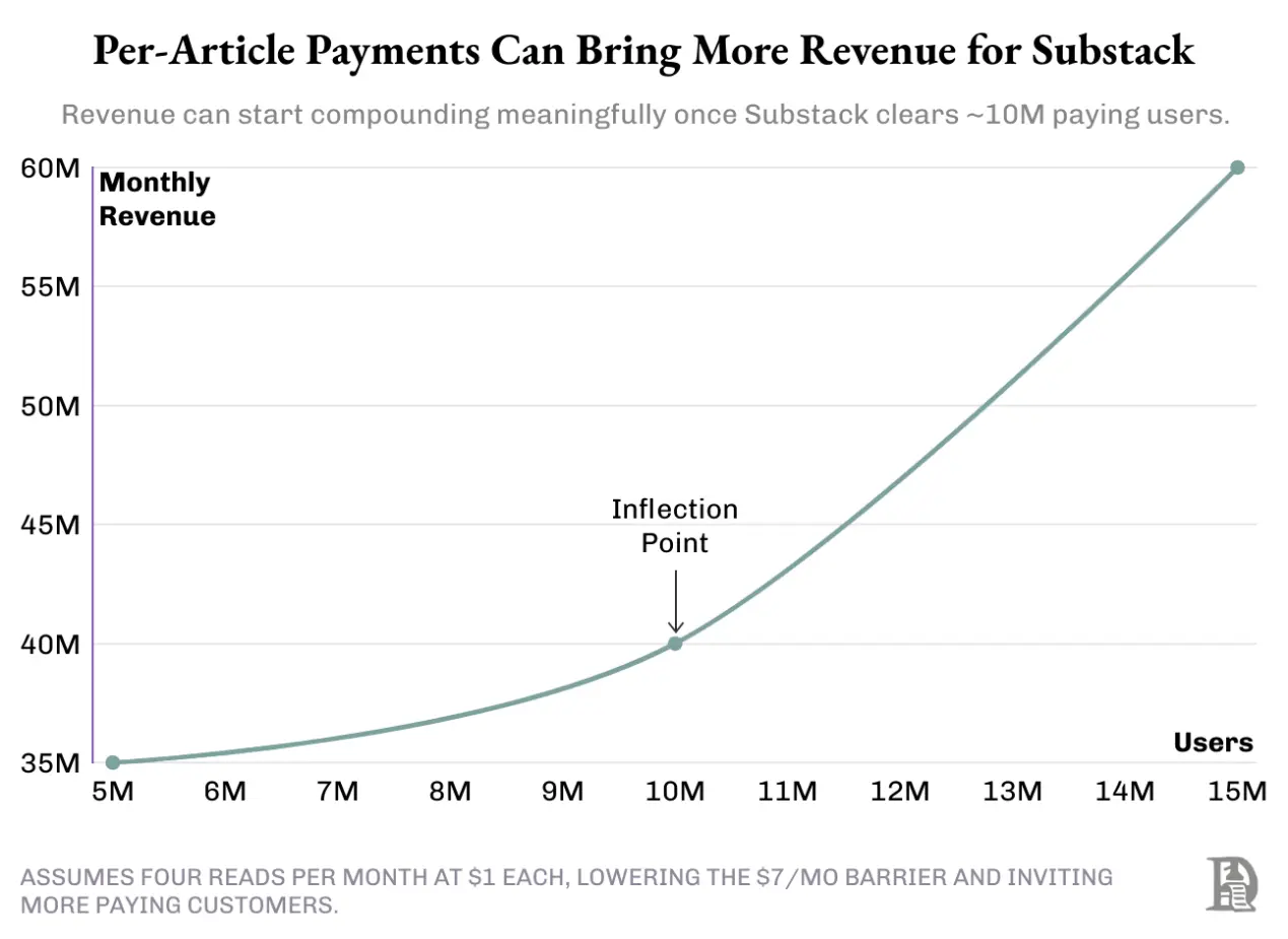 Substack 拥有 5000 万用户,付费转化率为 10%,即有 500 万订阅用户,每月平均支付约 7 美元。当付费订阅用户数量翻倍至 1000 万时,Substack 很可能会从小额支付中获得更多收益。由于用户付费门槛降低,更多休闲读者可能会转向为每篇文章付费,从而加速收入增长。