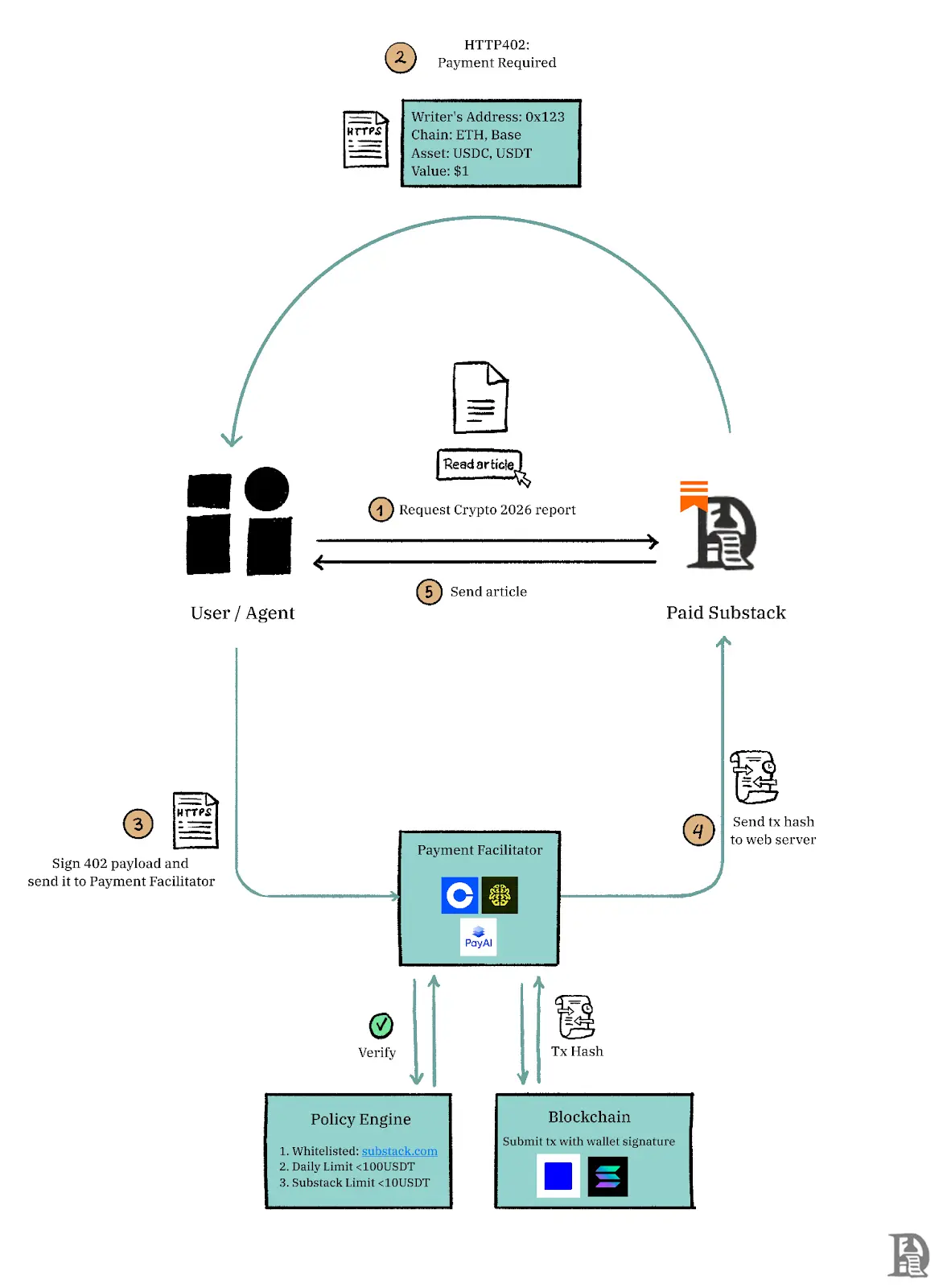 想象一下 Substack 对一篇优质文章收取 0.5 美元。当你点击 “付费阅读” 按钮时,Substack 会返回一个包含价格、接受的资产(例如 USDC)、网络(例如 Base 或 Solana)以及政策的 402 代码。内容大致如下: