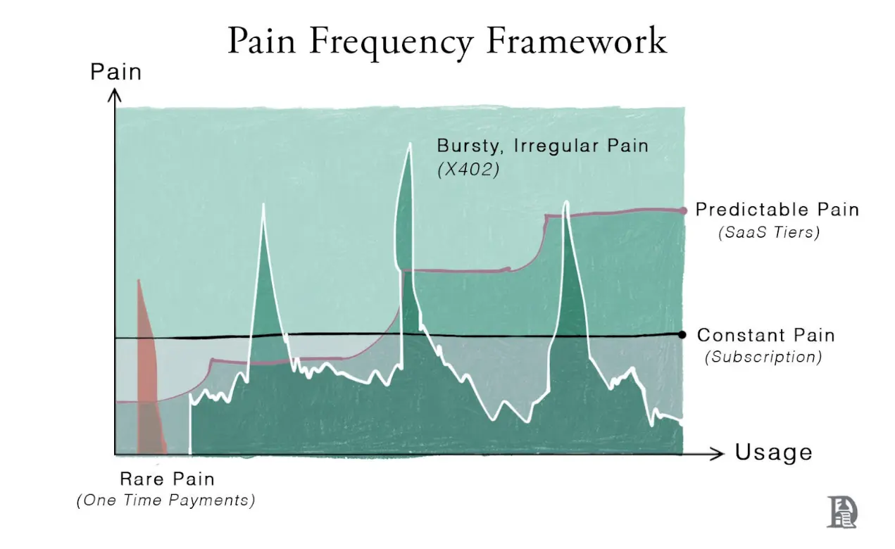 右上角是现代互联网的核心,涵盖了 LLM 查询、代理操作、无服务器突发流量、API 调用、跨链交易、批量作业以及物联网设备通信。使用量既稳定又波动。固定的收费模式虽然降低了付费心理门槛,但却无法准确反映这种现实。轻度用户支付过高的费用,而重度用户则享受补贴,导致收入与实际使用量脱节。