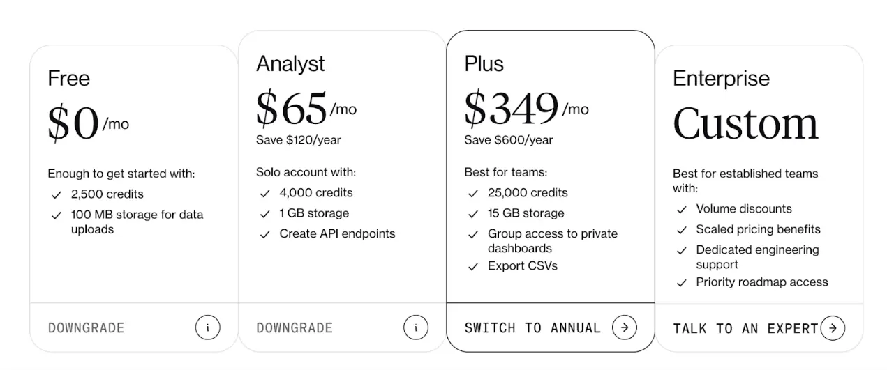 因此,基于席位收费的产品正逐渐向计量收费模式转变。保留用于协作和支持的基础套餐,但对高负载应用收费。例如,Dune 提供每月有限的额度。小型、简单的查询费用低廉,而运行时间更长的大型查询则需要消耗更多费用。