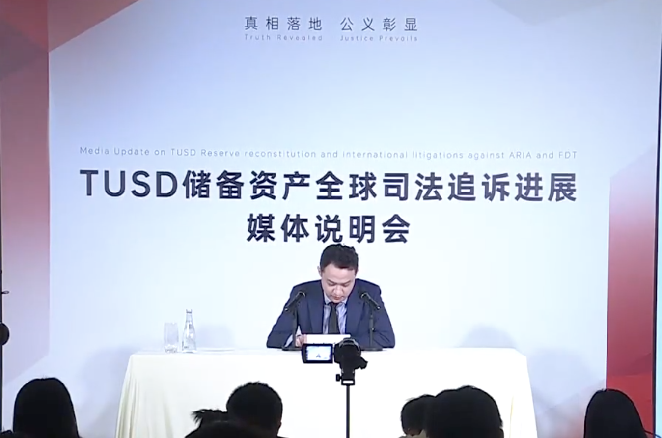 “正义或许会迟到,但绝不会缺席”。 近期,孙宇晨在 TUSD 储备金被挪用案迎来司法突破后发文表示。在发布会现场,“真相落地,公义彰显” 八个大字醒目地打在背景板上。