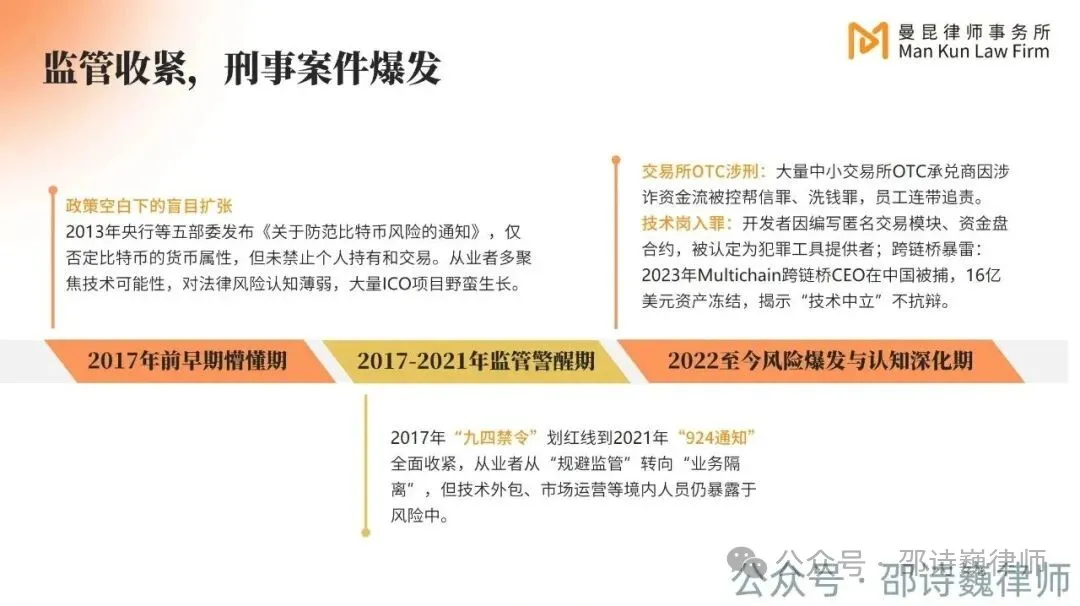 正如邵诗巍律师在郑州论坛中指出,自 2017 年以来,监管态度经历了从 “观望探索” 到 “划清红线”,再到 “全面打击与认知深化” 的演变过程。
