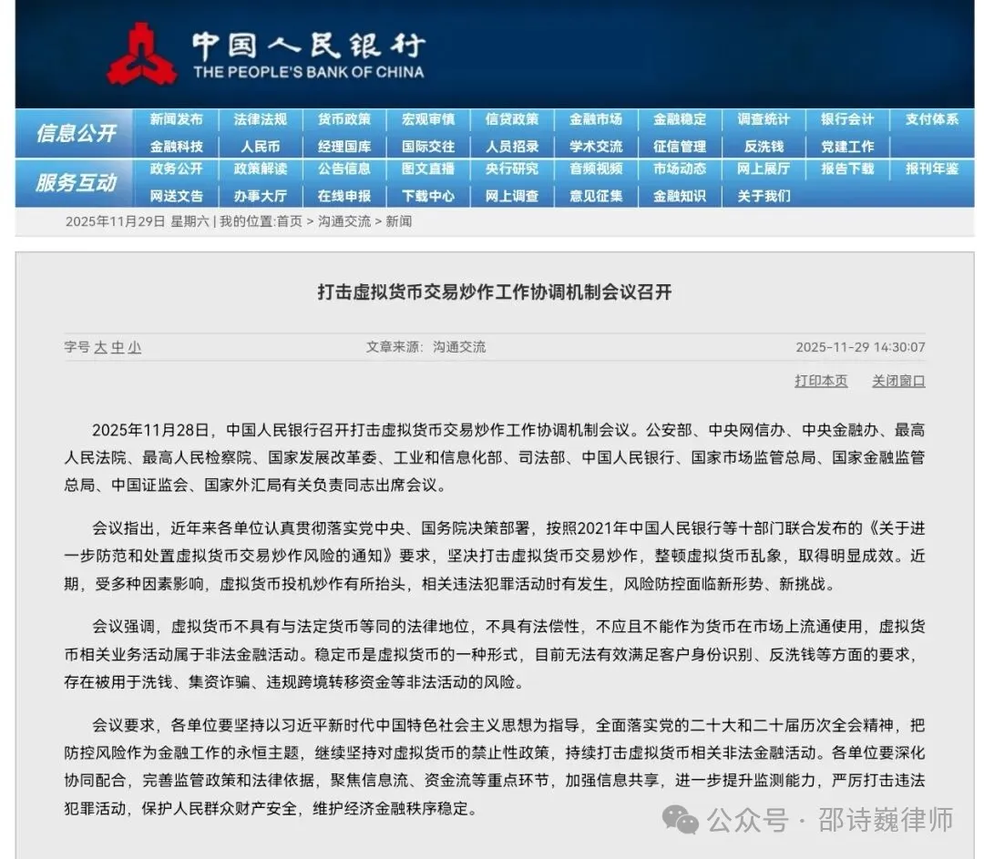 2025 年 11 月 28 日,中国人民银行联合公安部、最高人民法院、最高人民检察院等十三部门召开 “打击虚拟货币交易炒作工作协调机制会议”,再次明确虚拟货币相关业务活动属于非法金融活动,并强调将对各类虚拟货币交易炒作行为保持高压打击态势。