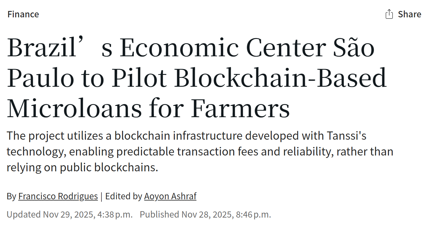 - 巴西圣保罗将开展基于区块链的农民小额贷款试点项目