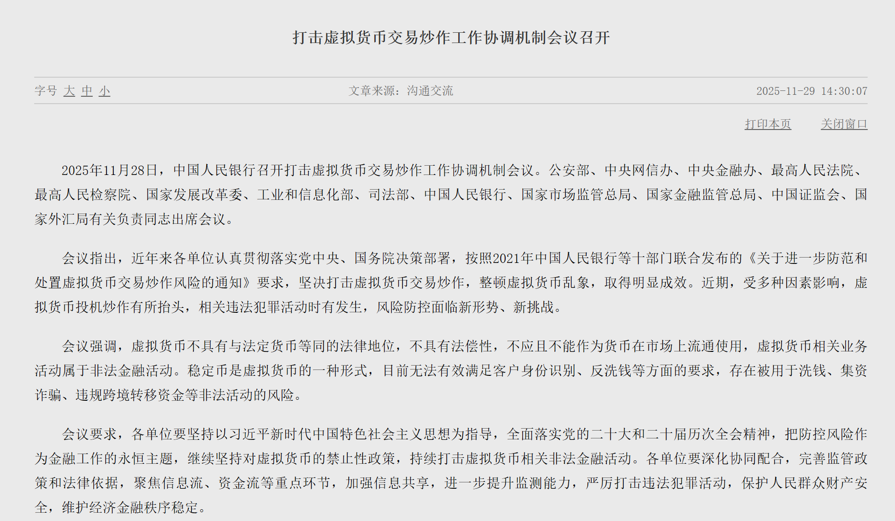 - 央行召开打击虚拟货币交易炒作会议,强调稳定币风险