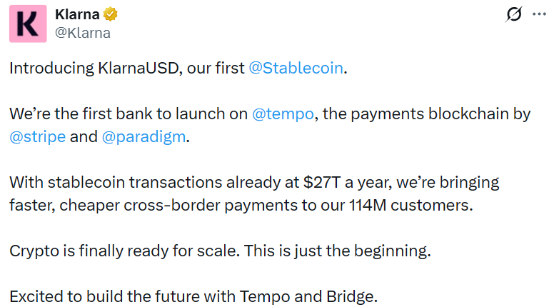 - 瑞典支付巨头 Klarna 旗下首个稳定币 KlarnaUSD 已提前上线