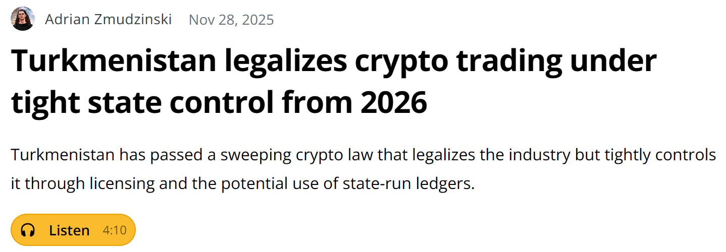 - 土库曼斯坦通过加密货币监管法案,2026 年起实施并受国家严格控制