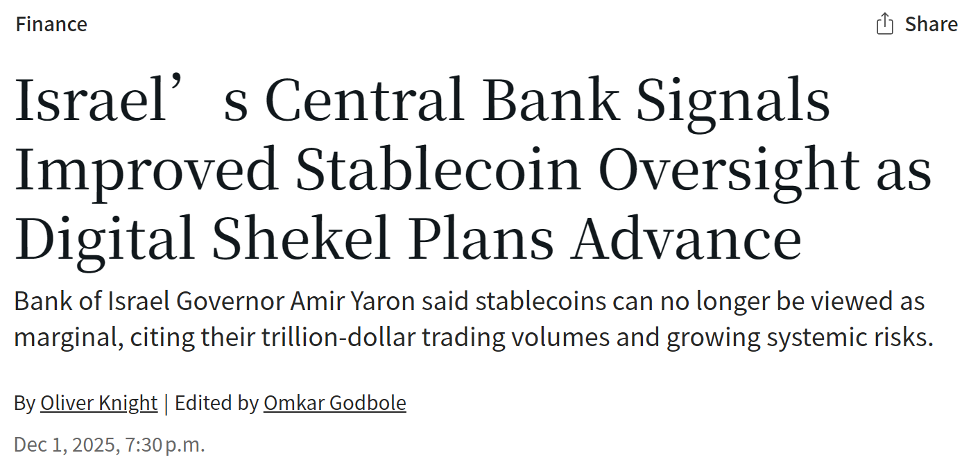 - 随着数字谢克尔计划推进,以色列央行释放加强稳定币监管信号