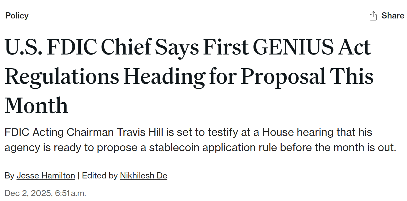 - FDIC 拟于本月公布首份 GENIU S 法案稳定币发行监管草案
