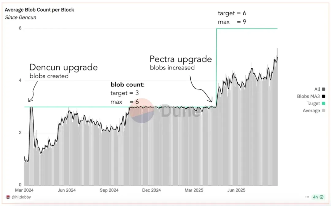 在 Dencun 升级中首次向网络添加 blob 时是 3 个(max 6),后来在 Pectra 升级中增加到了 6 个(max 9),在 Fusaka 之后,将可以以可持续的速度增加,而无需再进行大的网络升级。