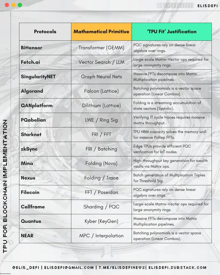 - Quantus(公链):后量子密码学签名依赖大规模向量运算,而 TPU 处理此类运算的并行化能力远超标准 CPU。