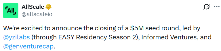 - 自托管稳定币数字银行 AllScale 宣布完成 500 万美元种子轮融资,YZi Labs 等领投