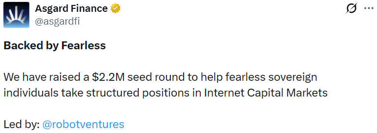 - DeFi 结构化头寸工具 Asgard 完成 220 万美元种子轮融资,Robot Ventures 领投
