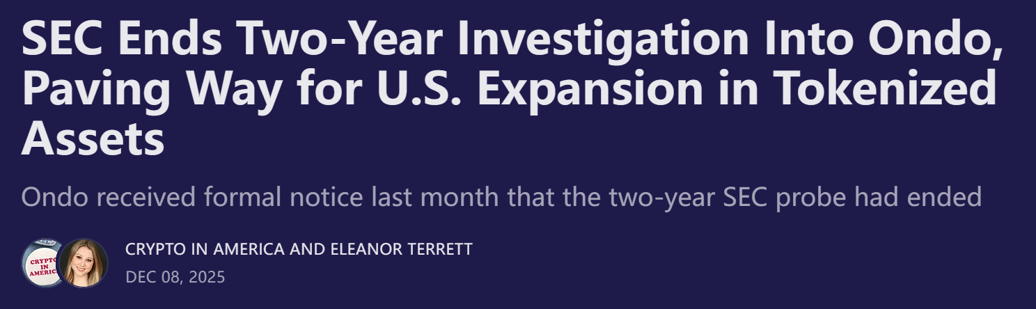 - 美 SEC 结束对 Ondo 两年的调查,未对其提出任何指控 ‘