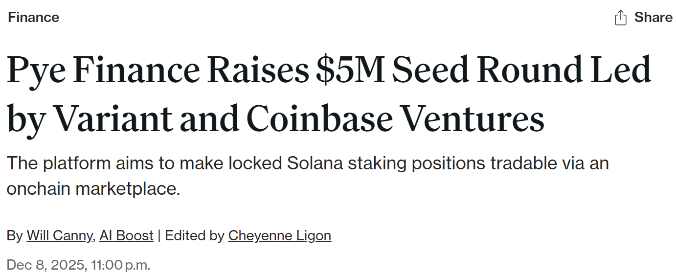 - Pye Finance 完成 500 万美元种子轮融资,Variant 和 Coinbase Ventures 领投
