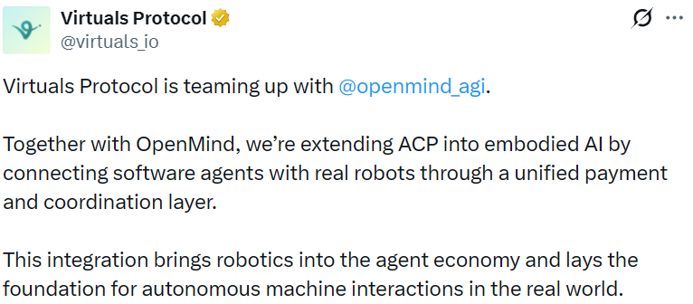 - Virtuals Protocol 与 OpenMind 达成合作