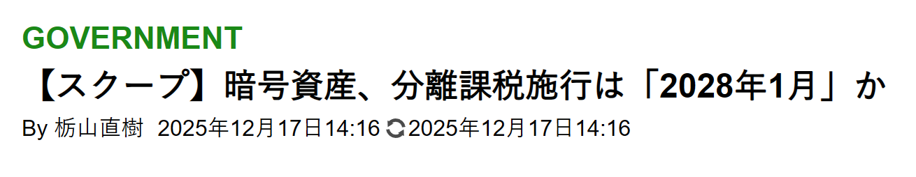 - 日本政府计划于 2028 年 1 月开始实施加密资产的「申报分离课税」制度