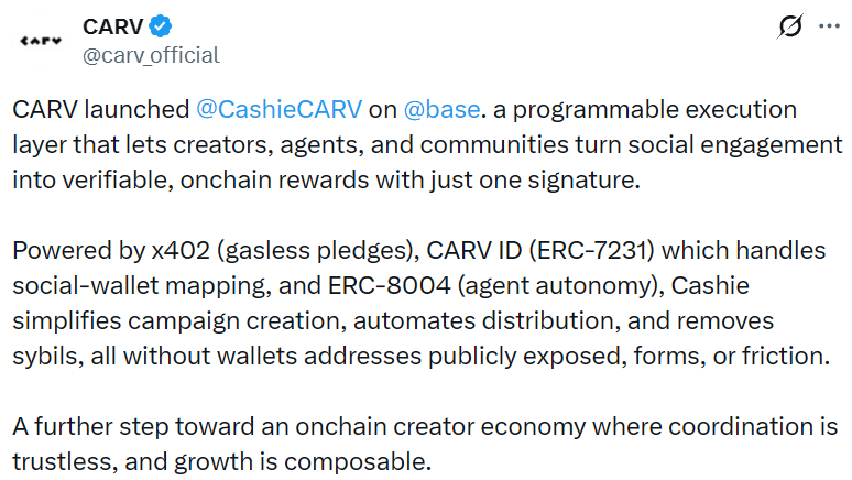 - CARV 在 Base 上线可编程执行层 Cashie