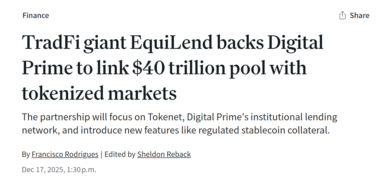 - 证券融资巨头 EquiLend 投资加密融资提供商 Digital Prime Technologies