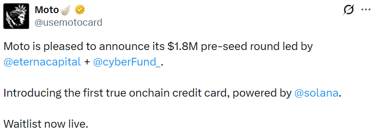 - 加密信用卡发行商 Moto 完成 180 万美元 Pre-Seed 轮融资