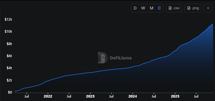 在过去的三年中,许多用户将资金从交易平台转出,这既是源于对第二次 FTX 式崩溃的恐惧,也是源于过去的去信念。中心化交易平台(DEXs)的累计交易量在三年中增长了两倍多,从 3.2 万亿美元增至 11.4 万亿美元。