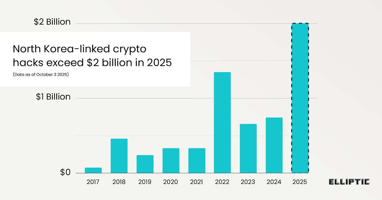 在 2025 年 1 月至 9 月期间,与朝鲜有关联的黑客窃取的加密货币已超过 20 亿美元。根据区块链分析公司 Elliptic 的数据,2025 年已成为按价值计算的数字资产犯罪最严重的一年。