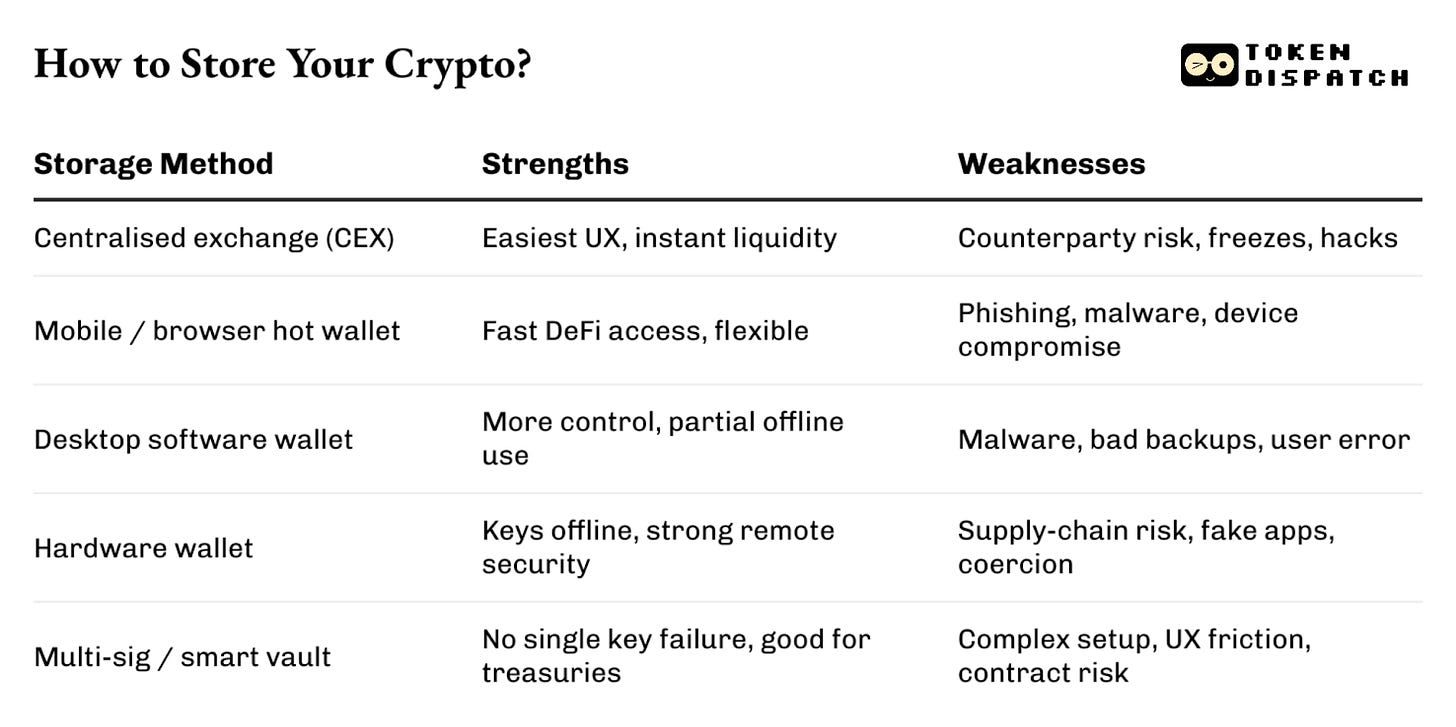 尽管这看起来非常安全文化的一种升级,但风险已从托管转移到 “自己不堪” 的破坏状态。笔记本电脑上的浏览器扩展程序、保存在手机聊天或电子邮件草稿中的助记词以及放置未加密笔记应用程序中的私钥,都无法有效抵御潜在的危险。