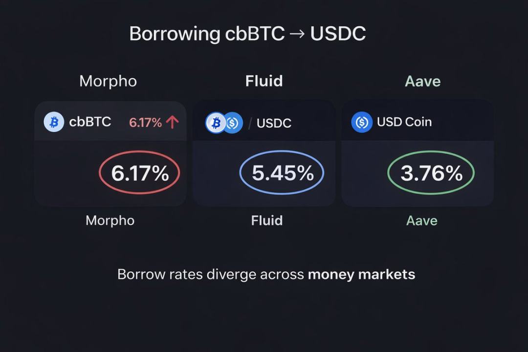 Coinbase 的案例恰好印证了这一点:用户可将其平台上的比特币(cbBTC)作为抵押借入 USDC,而这笔交易流量会被导向 Base 链上的 Morpho 借贷市场。尽管 Base 链上的 Aave 与 Fluid 平台,针对 cbBTC 抵押借入稳定币的业务提供了明显更优的利率,但 Morpho 仍占据市场主导地位。原因很简单,Coinbase 用户愿意为「眼前可见的便捷操作」支付额外成本。