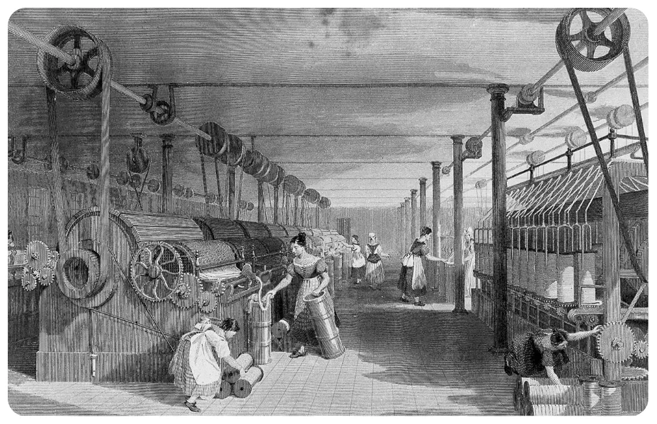 这幅 1835 年由托马斯·阿洛姆创作的版画描绘了英国兰开夏郡的一家纺织厂。它由蒸汽机驱动。