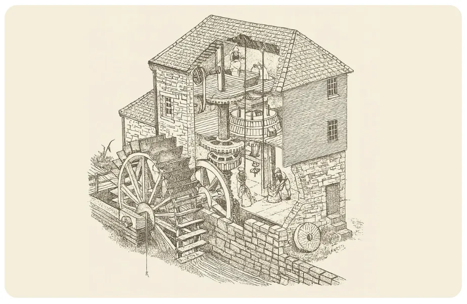 一个用水车为运营提供动力的磨坊。水虽然强大但不可靠,限制了磨坊只能在少数几个地点和特定季节运行。