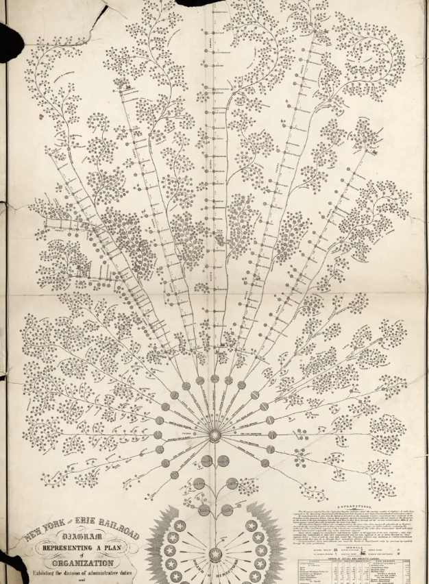 纽约与伊利铁路公司 1855 年的组织架构图。现代公司和组织架构是随着铁路公司的发展而演变的,铁路公司是第一批需要在广阔距离上协调数千人的企业。