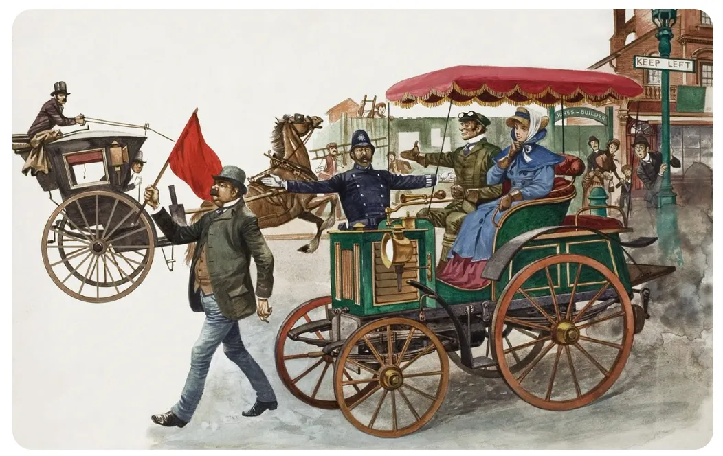 1865 年的《红旗法案》要求在车辆沿街行驶时,需有旗手在前面步行引导(该法案于 1896 年被废除)。这是 “人类在循环中” 这一不理想状态的一个例子。