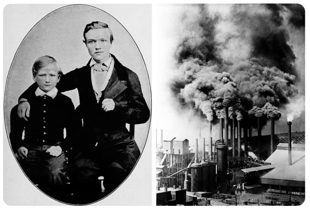 左侧:少年时期的安德鲁·卡内基和他的弟弟。右侧:镀金时代(Gilded Age)的匹兹堡钢铁厂。