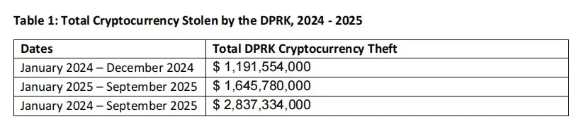 根据 MSMT 于 2025 年发布的研究报告,自 2024 年 1 月至 2025 年 9 月期间,朝鲜相关黑客组织通过攻击全球范围内的加密货币交易所、钱包服务商、多签基础设施及 Web3 生态相关企业,累计窃取至少 28.37 亿美元的加密资产。其中,仅 2025 年前九个月的盗取金额即达到约 16.45 亿美元,刷新历史纪录。