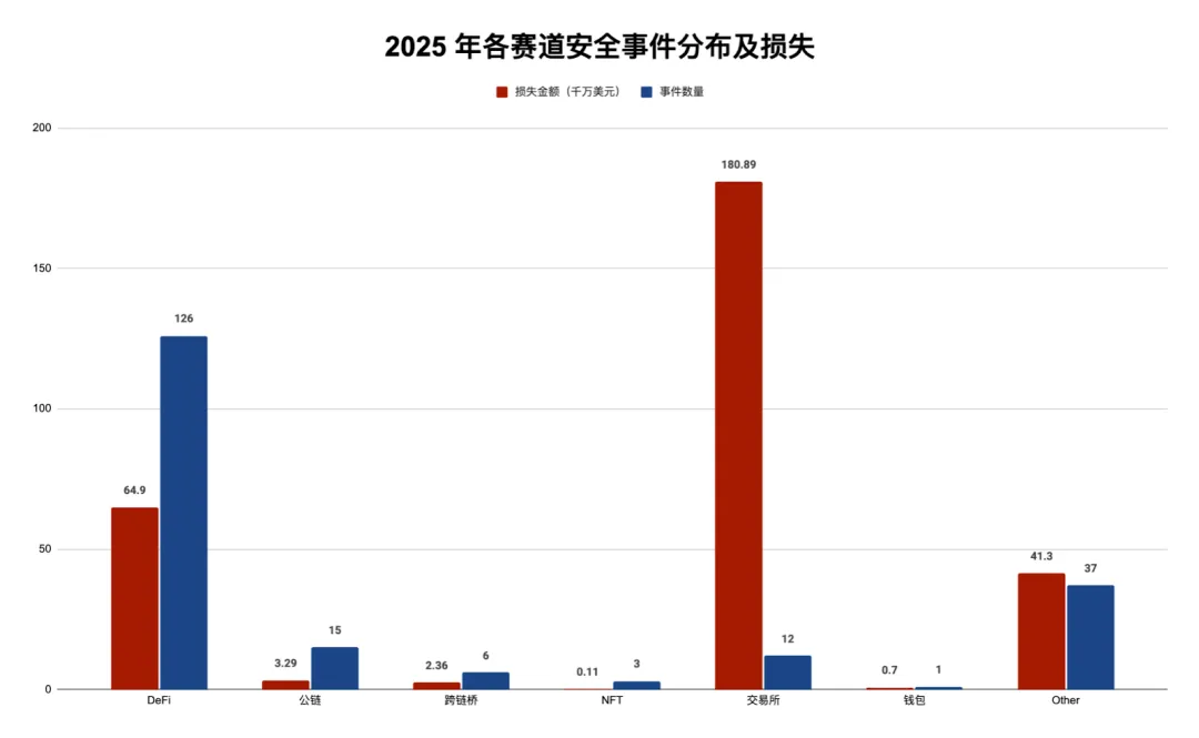 按项目赛道划分,DeFi 项目是最常遭攻击的领域:2025 年共发生 126 起安全事件,占全年总数约 63%,造成损失约 6.49 亿美元,相较 2024 年(339 起,损失 10.29 亿美元)下降约 37%。交易平台事件仅 12 起,却造成高达 18.09 亿美元损失,其中 Bybit 单次即损失约 14.6 亿美元,是全年最严重事件。