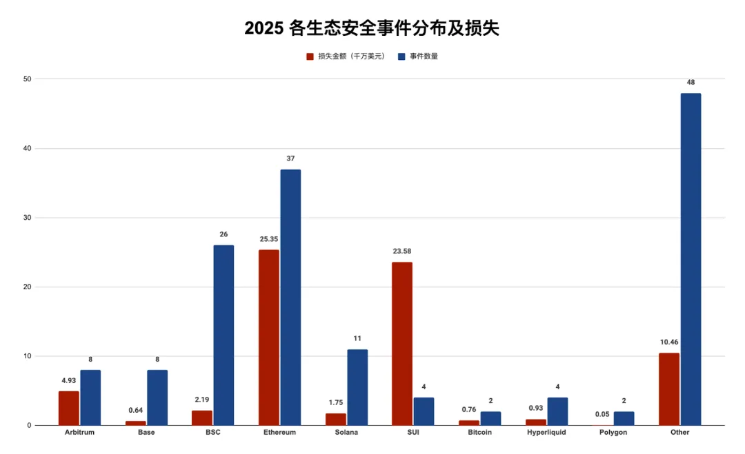从生态分布来看,Ethereum 仍然是受攻击最为频繁、损失最为严重的生态,全年损失约 2.54 亿美元,占比显著领先;BSC 紧随其后,相关损失约为 2193 万美元;Solana 则位列第三,全年损失约 1745 万美元。